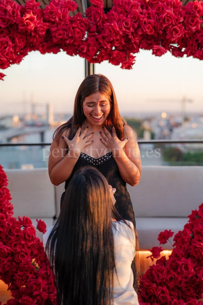 Hacer una pedida de mano en un rooftop en Madrid ya es una experiencia mágica por sí sola, pero si se suma un corazón gigante de flores, el momento se transforma en algo inolvidable, lleno de simbolismo, emoción y belleza. Es una idea perfecta para quienes quieren sorprender a su pareja con una propuesta original, romántica y visualmente impactante, en uno de los entornos más especiales de la ciudad.