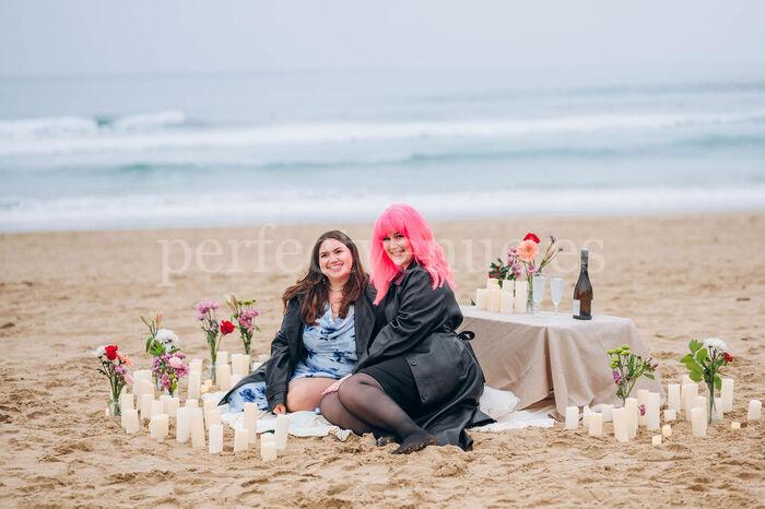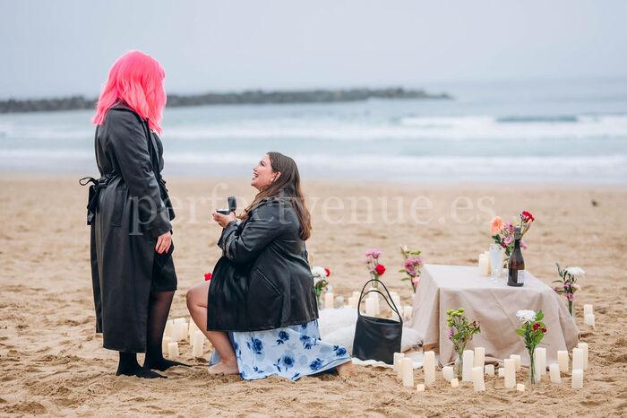 Our team takes care of the full organization, setup and coordination. A professional photographer is included to capture every moment naturally and discreetly, and we also handle the full beach proposal San Sebastián planning to ensure everything goes perfectly.