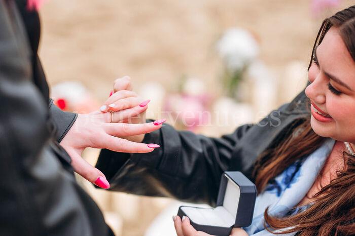 We design a picnic-style setup on the sand with an elegant boho aesthetic, carefully prepared to surprise. At the center, a low table dressed with neutral textiles, accompanied by fresh flowers, candles and a bottle of champagne with glasses ready for the celebration.