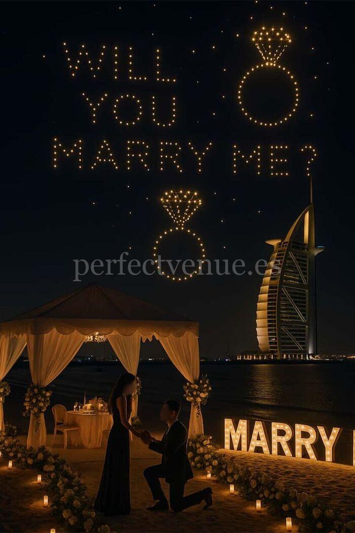 The key moment comes with the drone show, where shapes, messages or even the big question are displayed in the sky through light choreographies. It is a fully personalized experience designed to create an unforgettable memory.