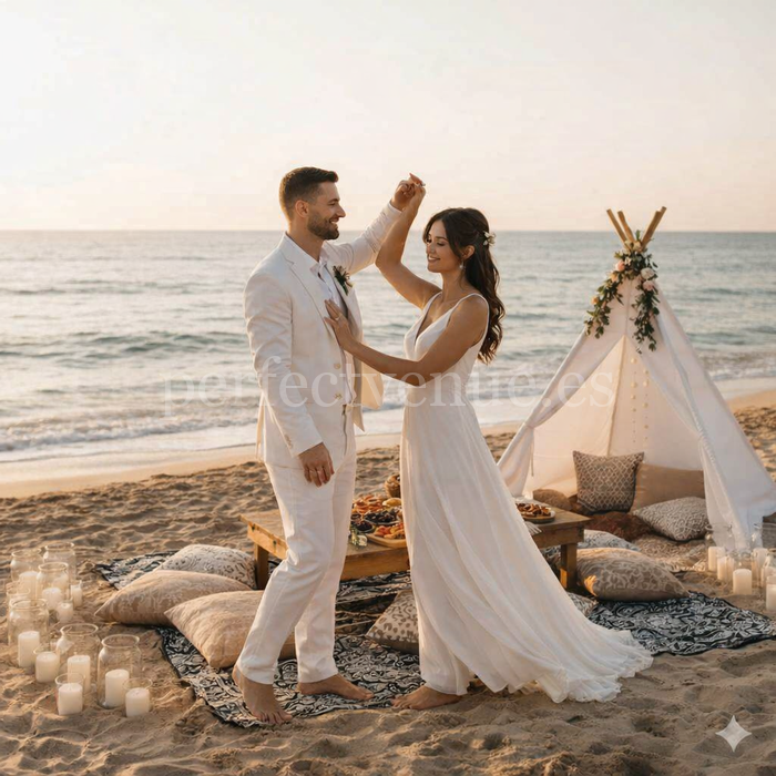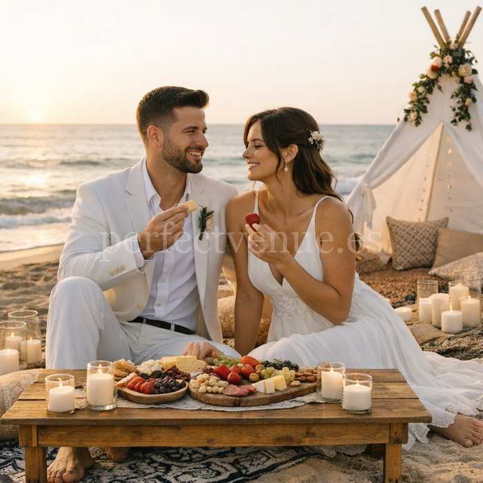 For this experience, we organize a picnic elopement in Málaga in a carefully selected location. It could be a quiet beach, a viewpoint overlooking the Mediterranean, or a charming natural spot in the surroundings of the city. Each location is chosen to create an intimate atmosphere that makes the moment truly special.