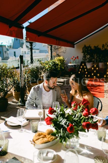 The setting combines the elegance of a modern space with the magic of Madrid’s nighttime lighting. The atmosphere is decorated with romantic details and flowers, creating the perfect setting for a marriage proposal, an anniversary, or a unique date that will remain etched in both your memories.