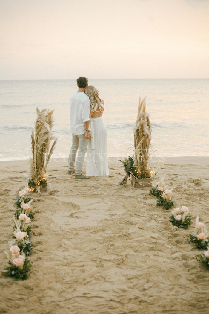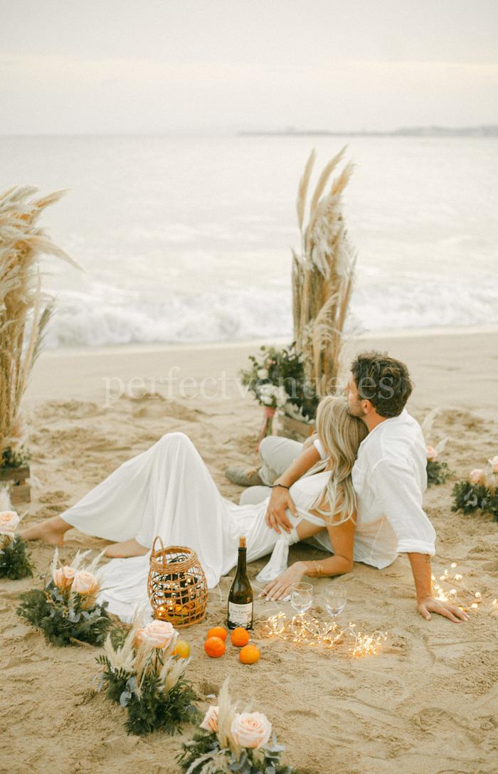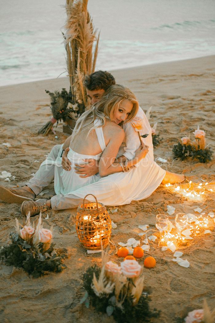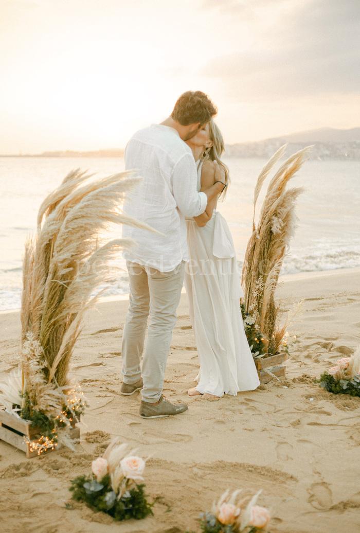 Этот elopement на пляже на Майорке проходит на красивом пляже с декором в стиле бохо, создающим расслабленную и элегантную атмосферу.