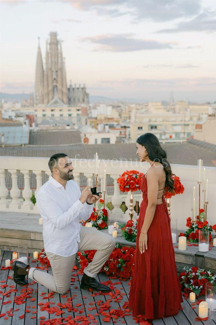 Наш пакет услуг для частного свадебного предложения на крыше в Барселоне включает аренду помещения только для вас, что гарантирует полную приватность вечера. У вас также будет возможность выбрать оформление, от элегантного ковра до больших букв «Marry Me», свечей, лепестков роз и красных роз, подстраивая все под свой стиль.